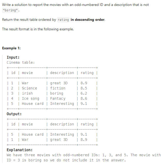 return cinema[(cinema['id']%2==1) & (cinema['description']!='boring')].sort_values(by='rating',ascending=False)