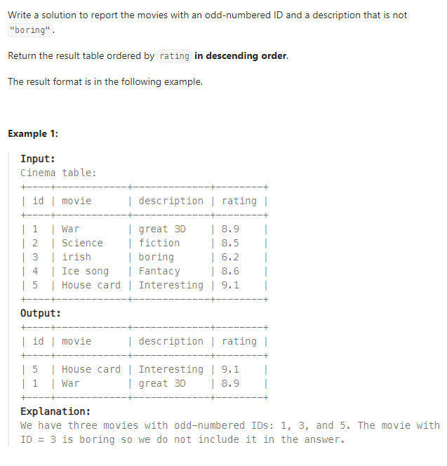 따라서 WHERE (ID%2)=1 AND description NOT IN ('boring') 를 입력해주었고